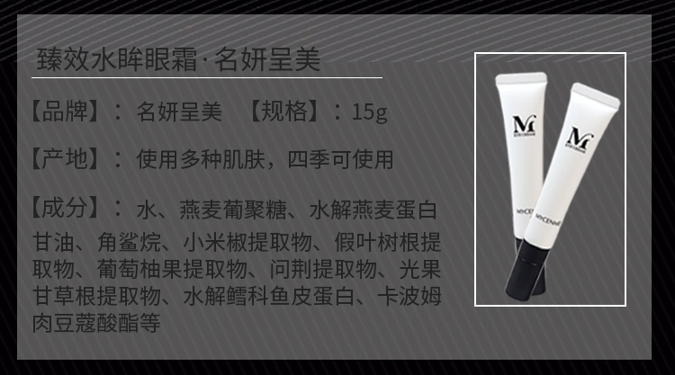 • 商品名称:名妍呈美 臻效水眸眼霜15g淡化细纹、紧致眼周、滋养润泽、减淡鱼尾纹、改善黑眼圈、透亮肤色