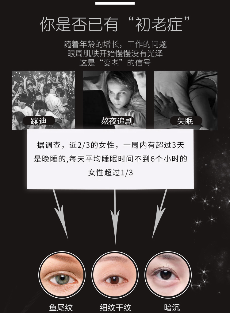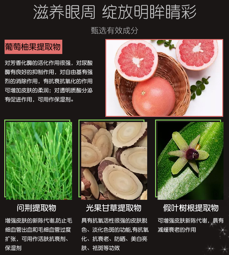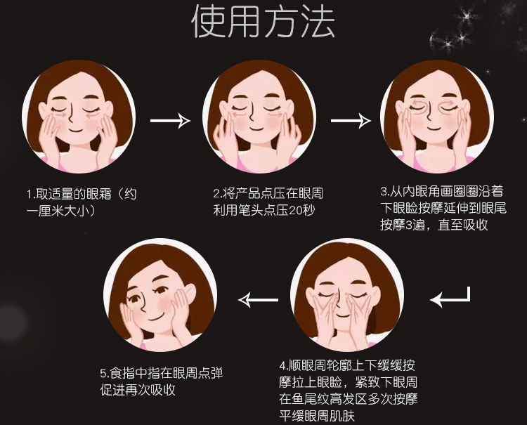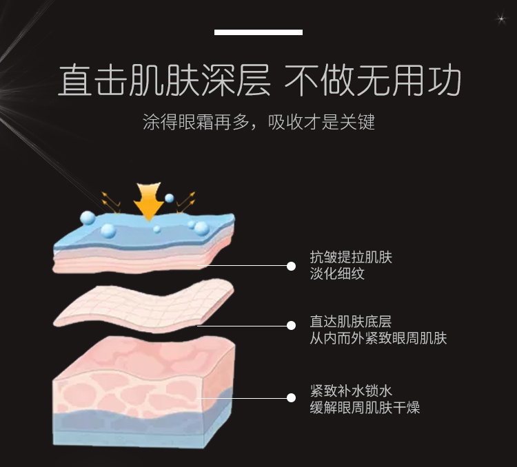 1.抗皱提拉肌肤淡化细纹。2.直达肌肤底层从内而外紧致眼周肌肤。3.紧致补水锁水缓解眼周肌肤干燥
