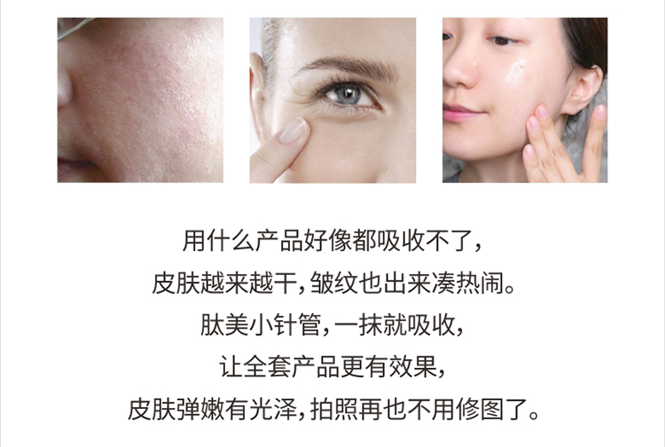 用什么产品好像都吸收不了,皮肤越来越干,皱纹也出来凑热闹。肽美小针管, 一抹就吸收,让全套产品更有效果,皮肤弹嫩有光泽,拍照再也不用修图了