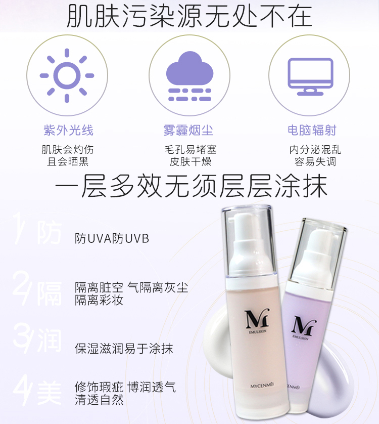 1.防:防UVA防UVB。2.隔:隔离脏空气,隔离灰尘,隔离彩妆。3.润:保湿滋润易于涂抹。4.美:修饰瑕疵,博润透气,清透自然