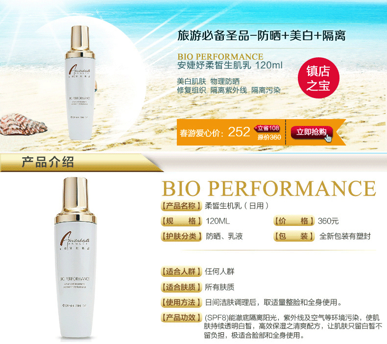 防晒亮白,提高肌肤抵抗力。1.(SPF8+++)能澈底隔离阳光, 紫外线及空气等环境污染, 使肌肤持续透明白皙;2. 有保湿之清爽配方, 让肌肤只留白皙不留负担, 适合脸部和全身使用