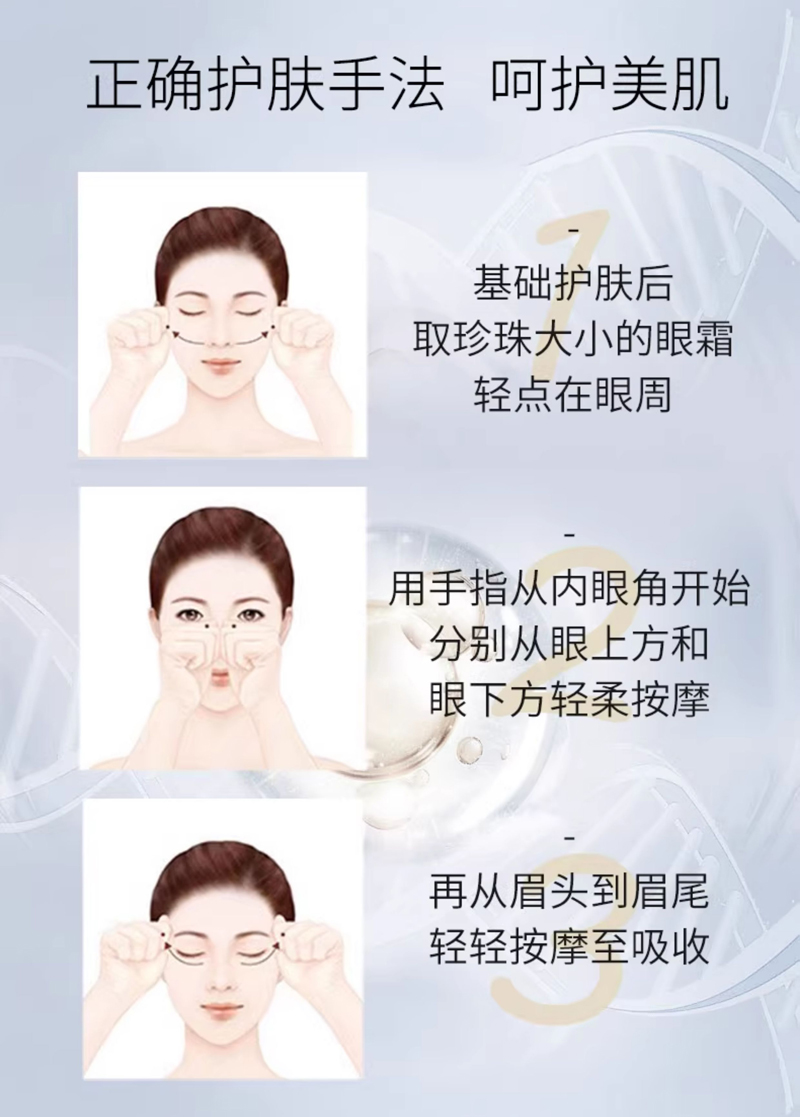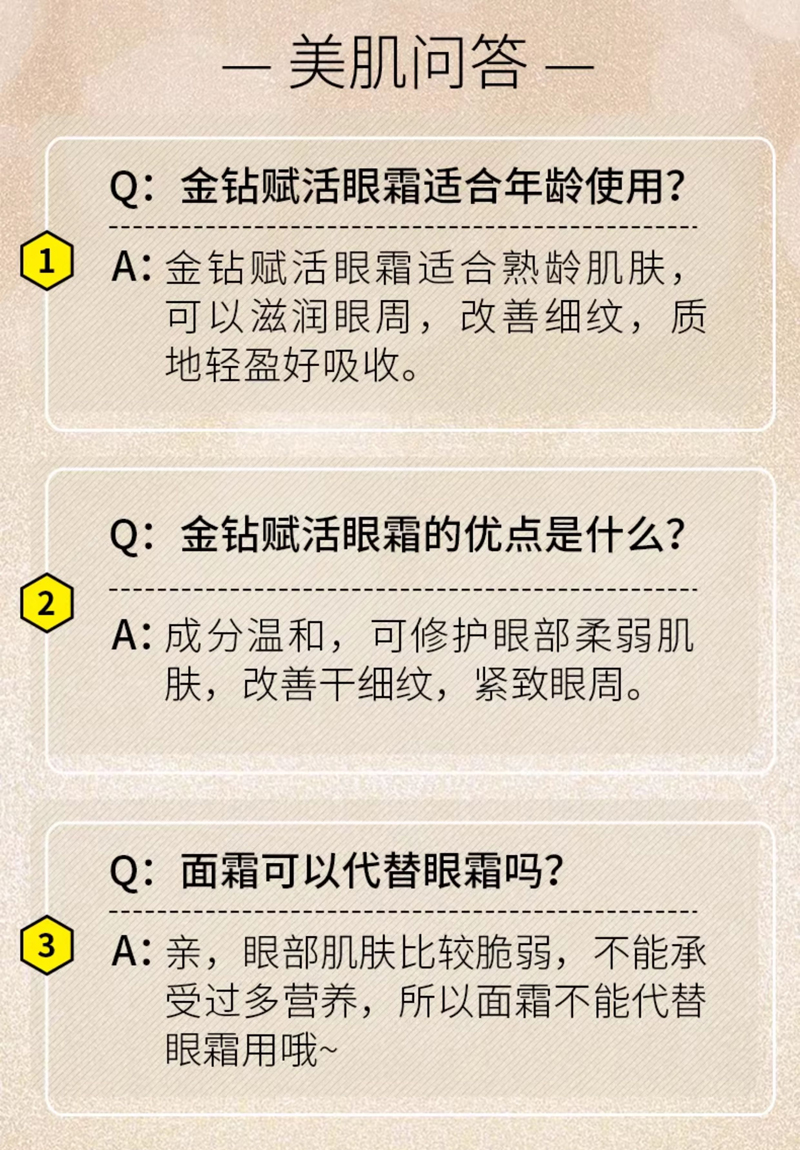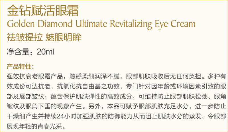 • 商品名称:安婕妤 金钻赋活眼霜20ml 柔细润泽、光滑眼周、淡化细纹、轮廓上扬、改善眼部松弛/眼角皱纹/眼角下垂等问题