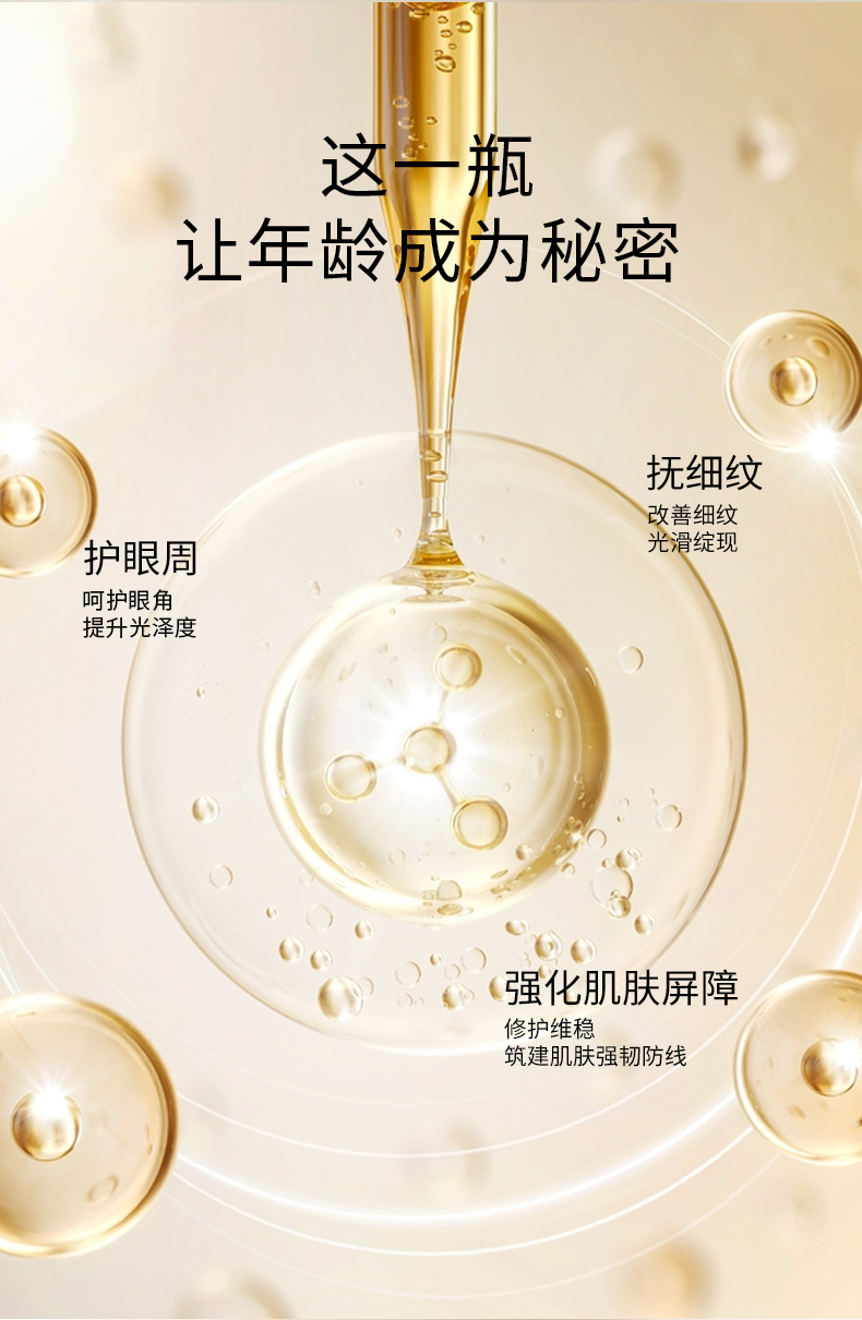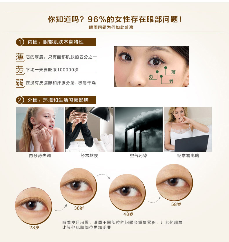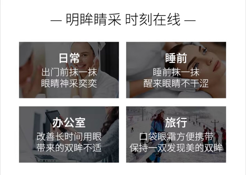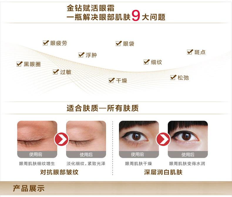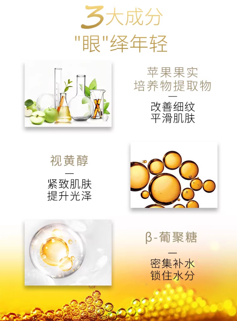 1.多效抗衰眼霜产品,触感柔细润泽不腻,眼部肌肤吸收后无任何负担;2.多种有效成份可达抗老,抗氧化抗自由基之功效,专门针对因年龄或环境因素引致的眼部及唇部皱纹;3.蕴含保护肌肤弹性的成份,可维持防止眼部肌肤松弛、眼角皱纹及眼角下垂的现象产生