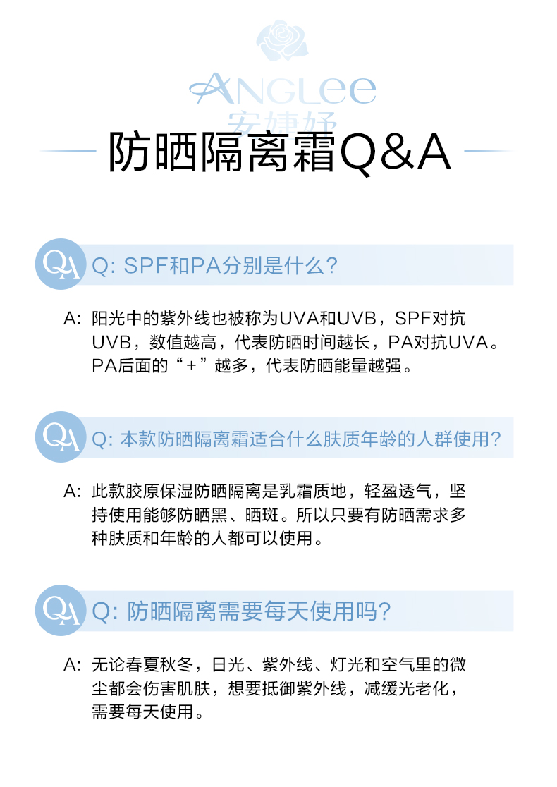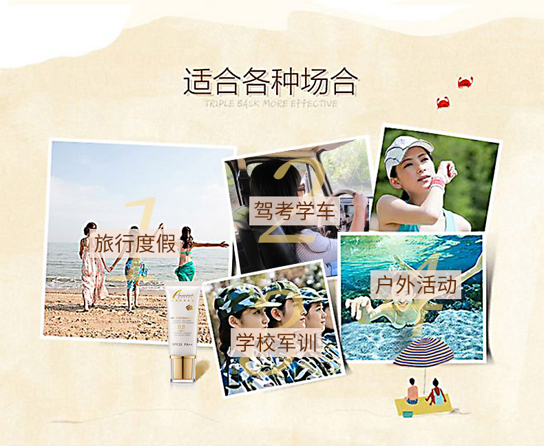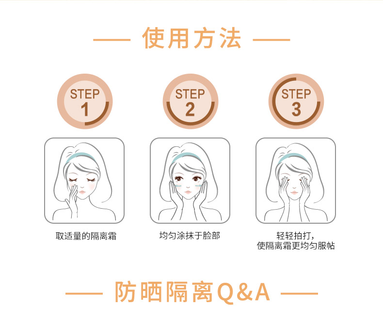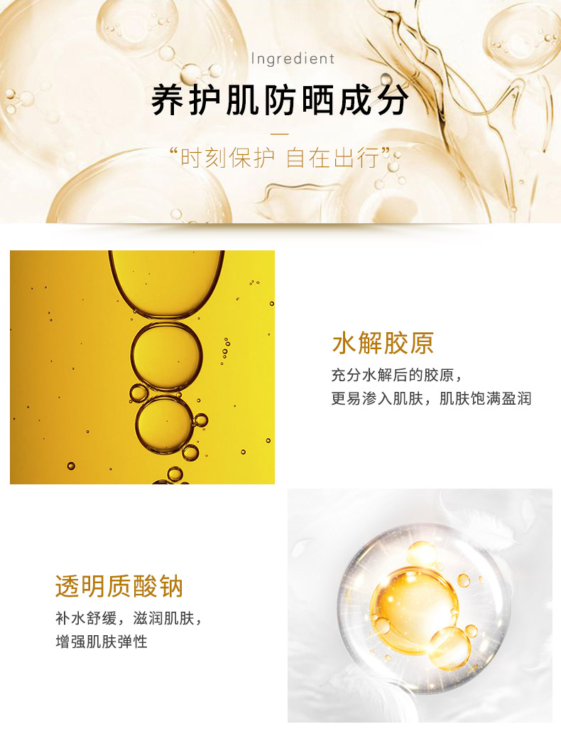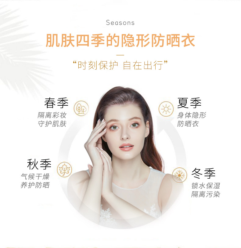 防晒、隔离、保湿、修颜四位一体!抵御紫外线.污染.残妆对皮肤带来的伤害,隐形毛孔,遮蔽瑕疵,匀净肤色,呈现自然裸妆果,富含珍贵保湿赋活因子,滋养不油腻,令肌肤持久水嫩光滑