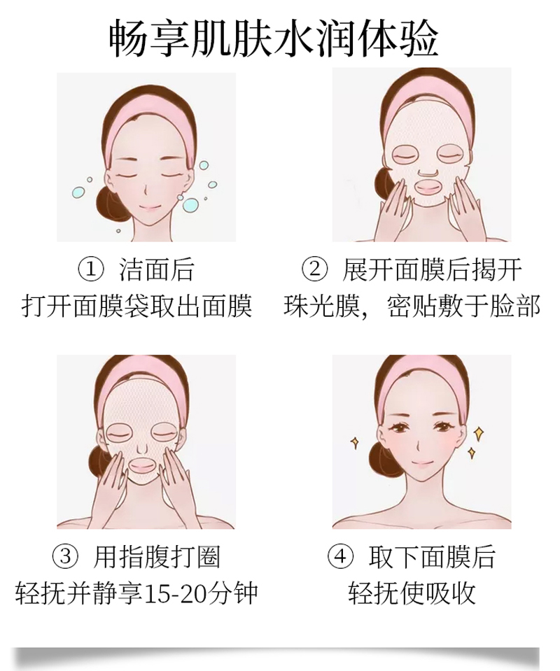 使用方法:洁肤后,将面膜完整摊开,敷于全脸,轻按至面膜与肌肤完全贴合,15-20分钟后取下面膜,轻轻按摩,使精华液充分被肌肤吸收。建议每周两至四次。
