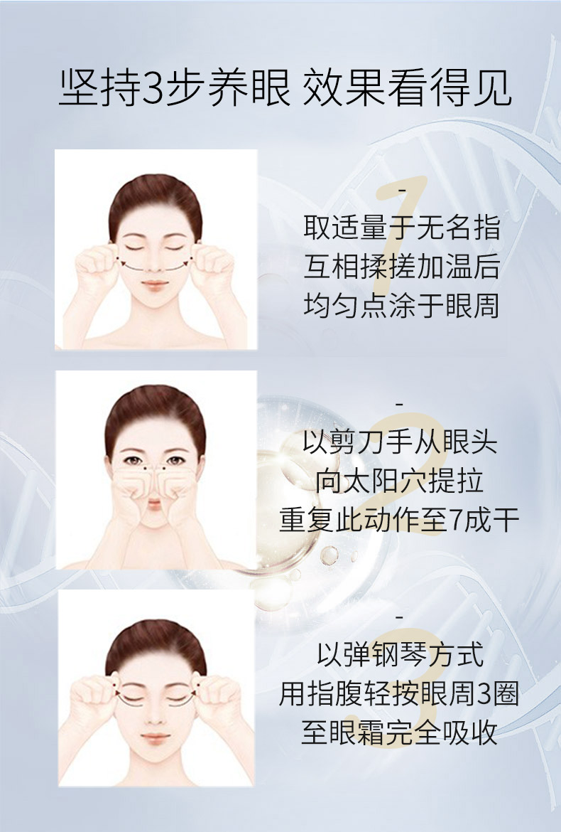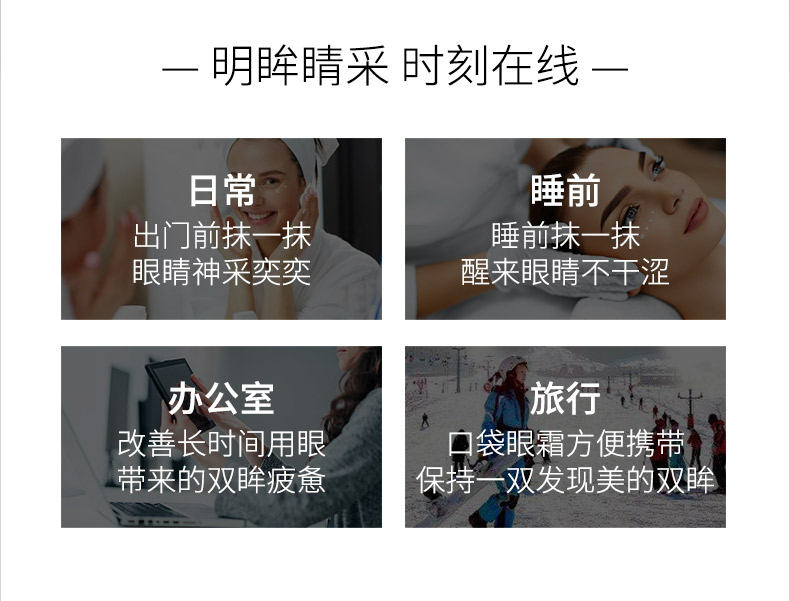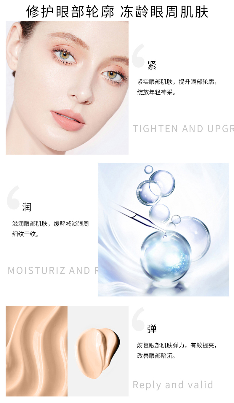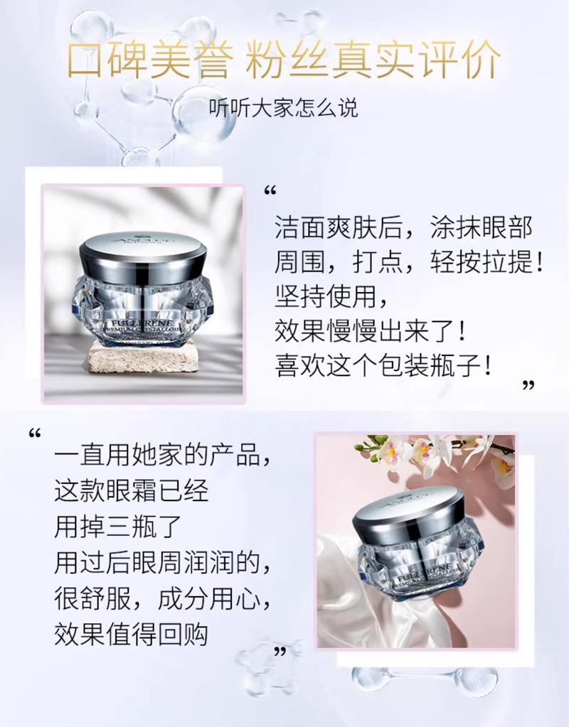 钻石烯复配酵母精华、辅酶Q10,可焕亮眼周、改善眼周皱纹,让眼周肌肤感受丰润滋养,尽显柔滑紧密,双眸焕发年轻(尤其适合松弛,无弹性,有细纹的肌肤)