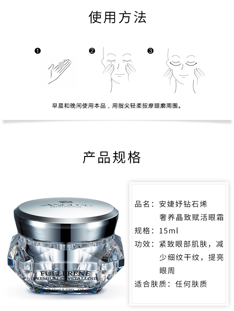 • 商品名称:安婕妤 钻石烯奢养晶致赋活眼霜15ml 减少眼部细纹干纹、提升紧致度、改善黑眼圈、滋养柔润