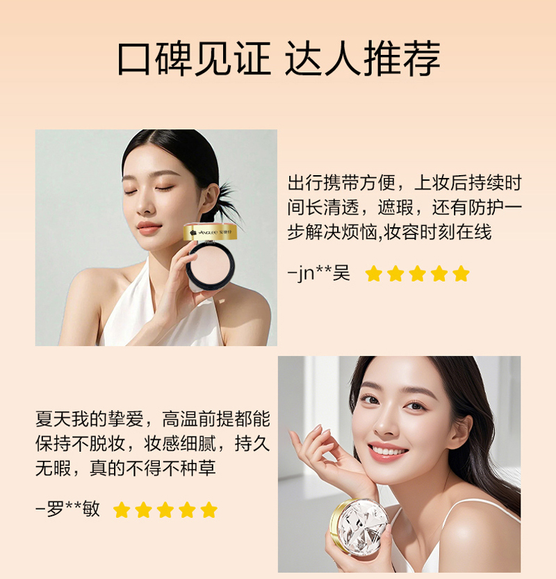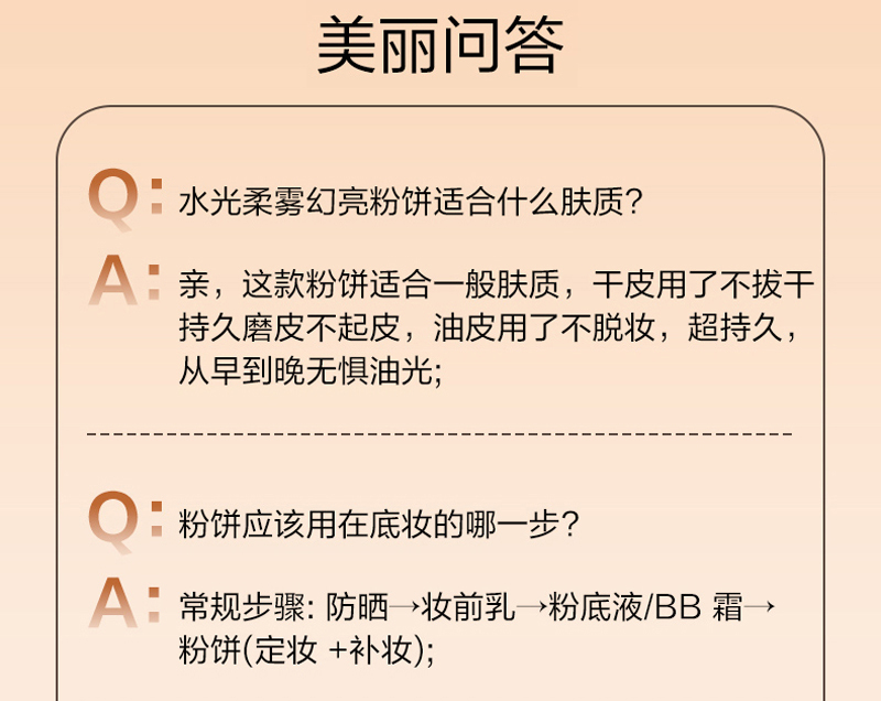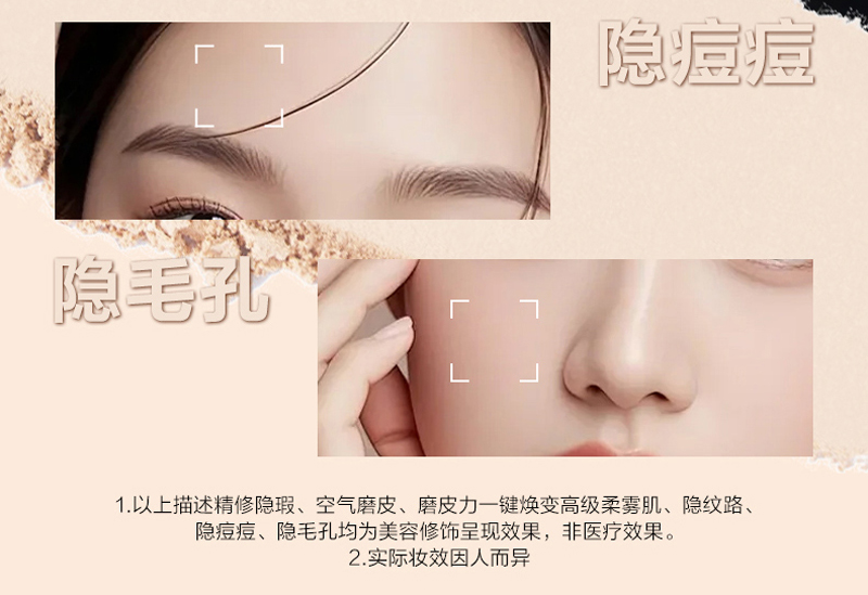 产品用途:干湿两用粉饼,定妆的同时改善肌肤小细纹,毛孔粗大,凹凸不均匀等现象,修饰遮瑕,让肌肤自由呼吸。