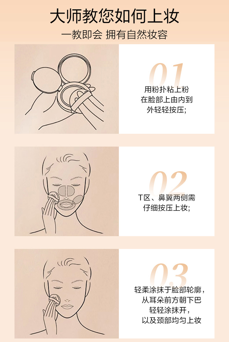 湿用:润肤后,将粉扑浸湿后挤干,再蘸取少许粉在脸上均匀抹开,遮瑕同时塑造盈透妆容
