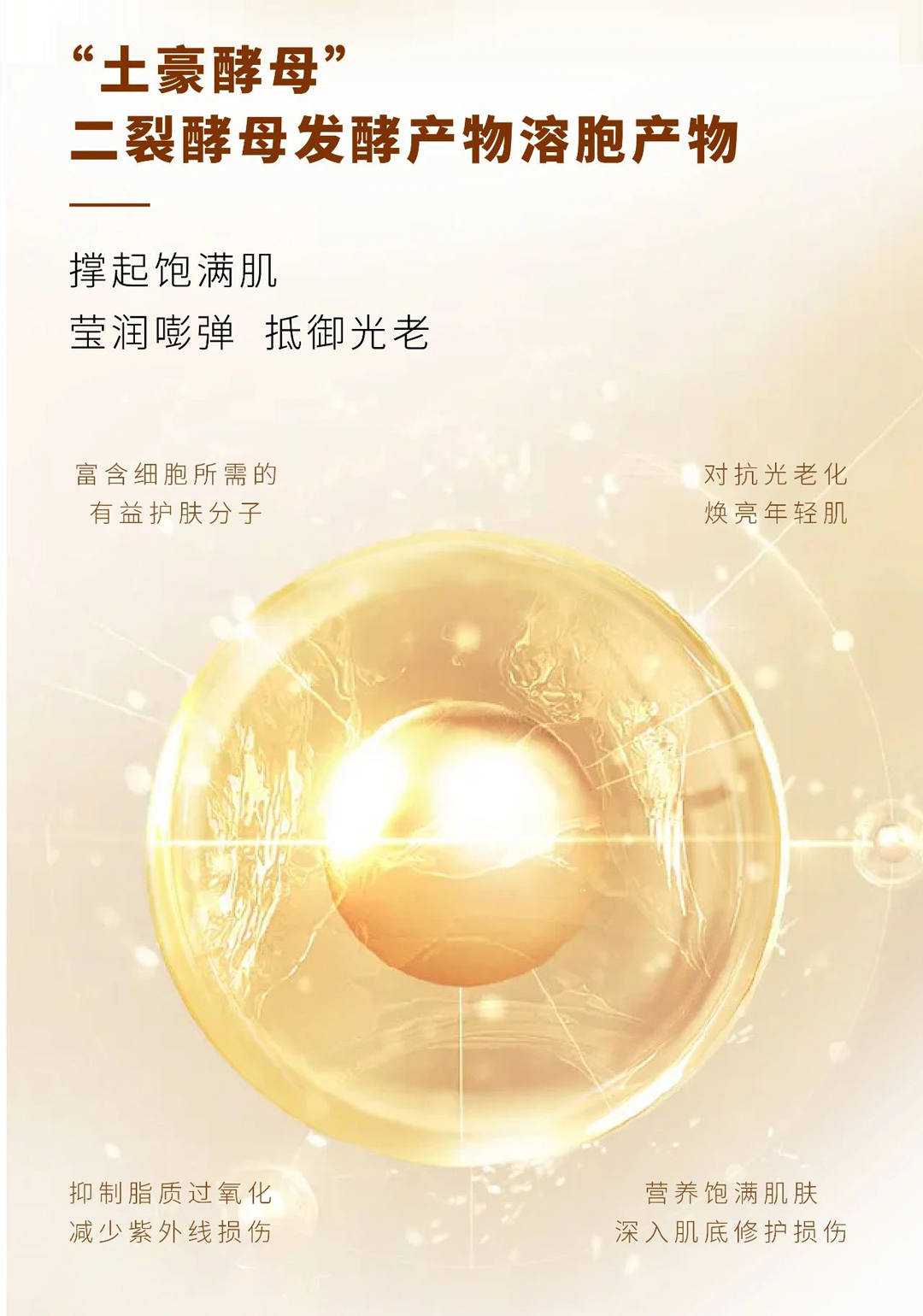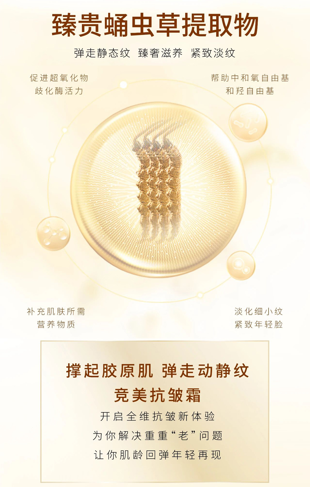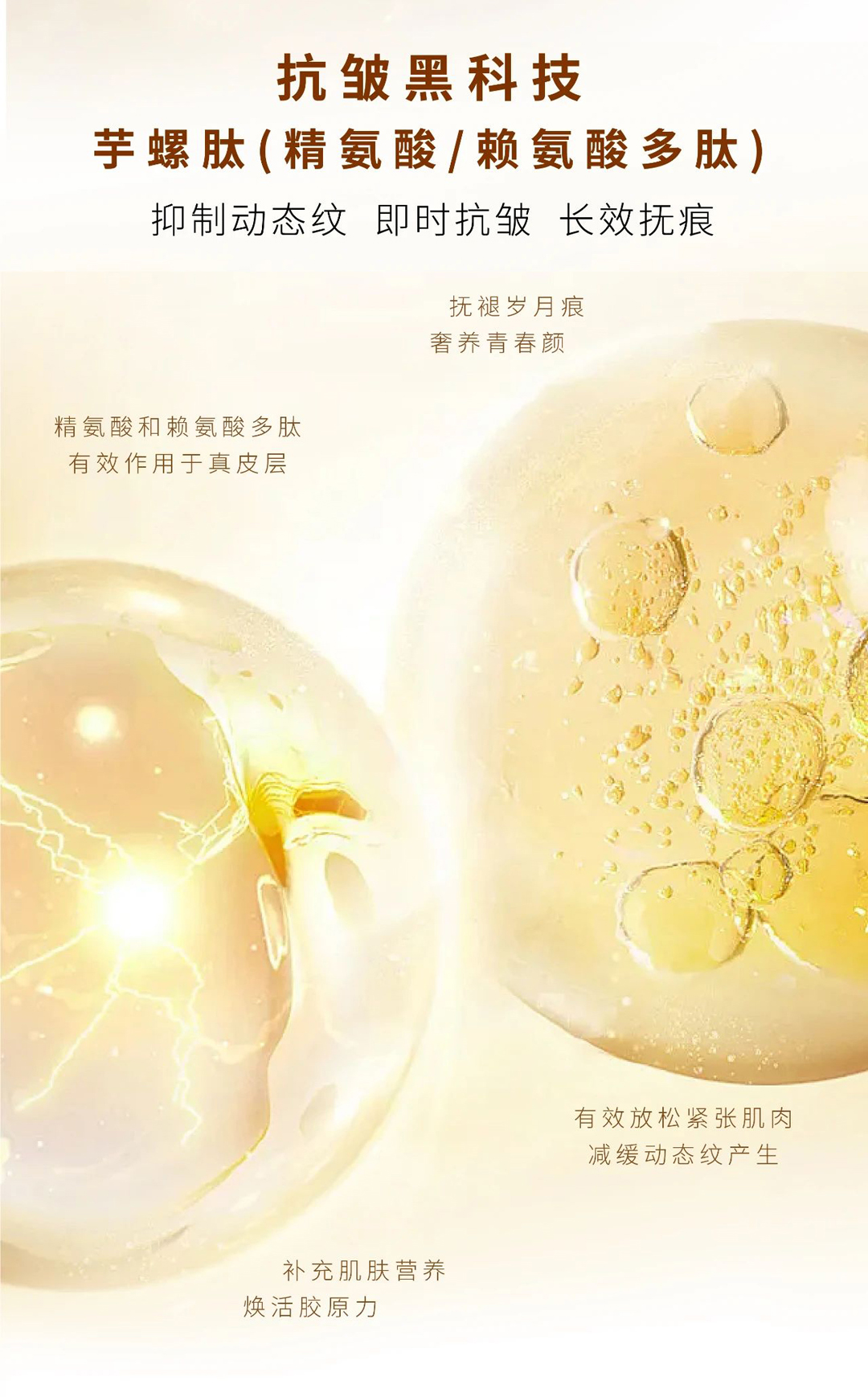 焕活肌肤胶原与弹力,抑制动态纹,弹走静态纹,撑起饱满肌,紧致淡纹,莹润嘭弹,抵御光老