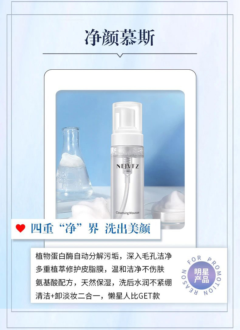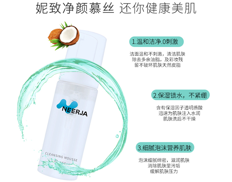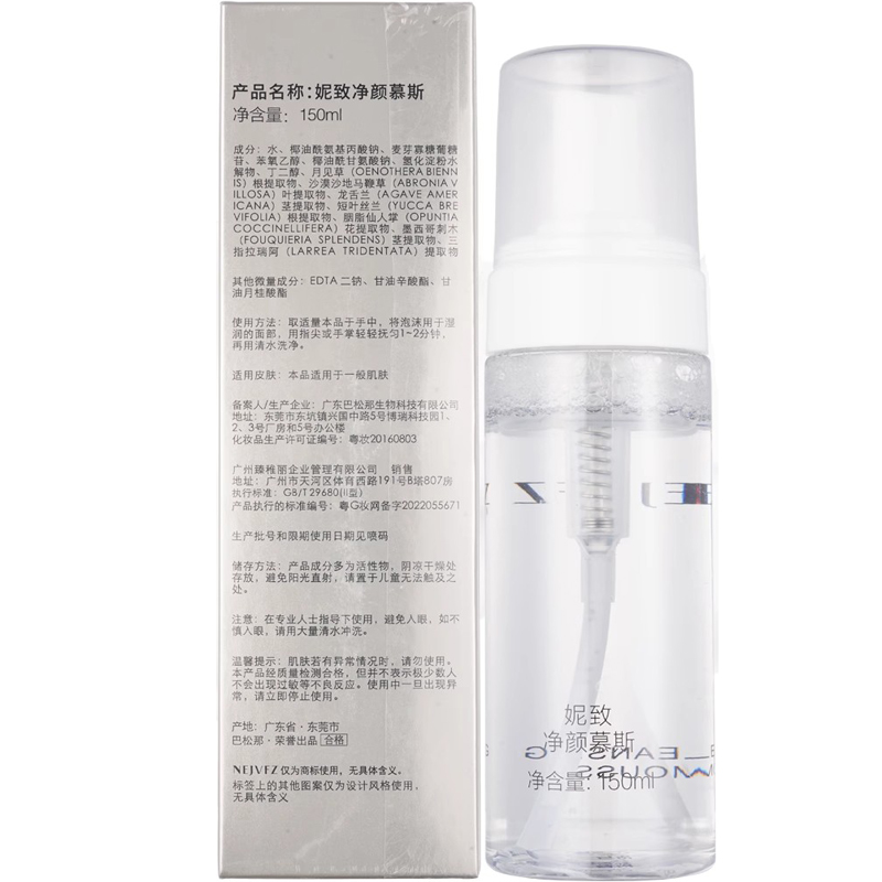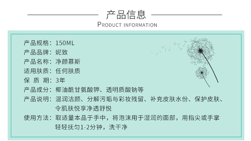 • 商品名称:妮致 净颜慕斯150ml 绵密泡沫、温和净澈、深入清洁毛孔及污垢、净透水润、温和不刺激