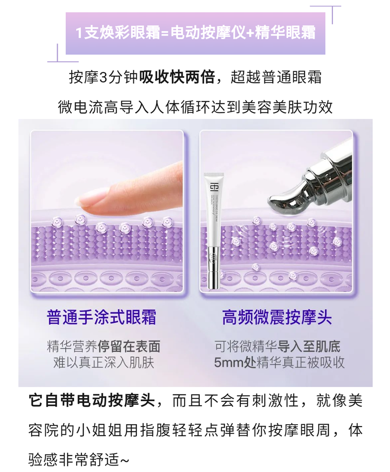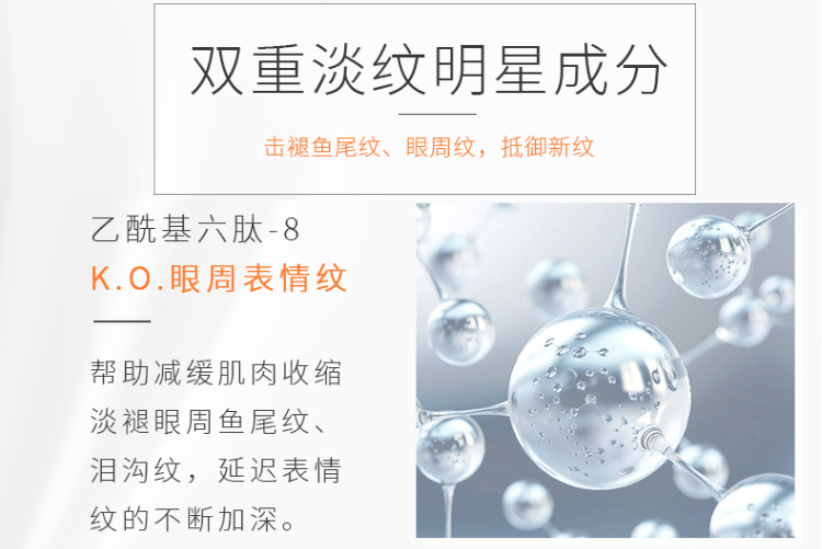 细腻的霜体质感,舒润柔滑,淡化细纹皱纹,去除黑眼圈,眼部赋活焕新,绽现年轻光采(定向抚纹,逆龄新生,深层补水-滋养眼周肌肤。击褪暗沉-告别眼圈眼袋。水嫩双眸-保持年轻状态)