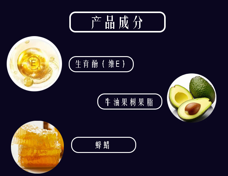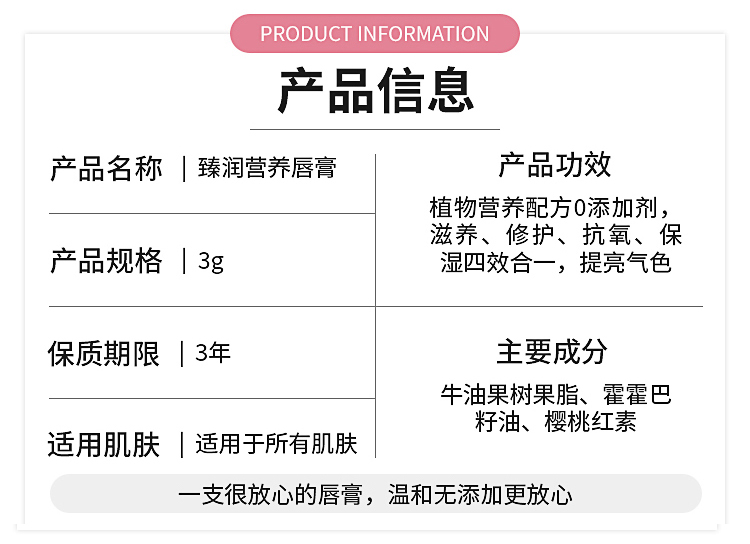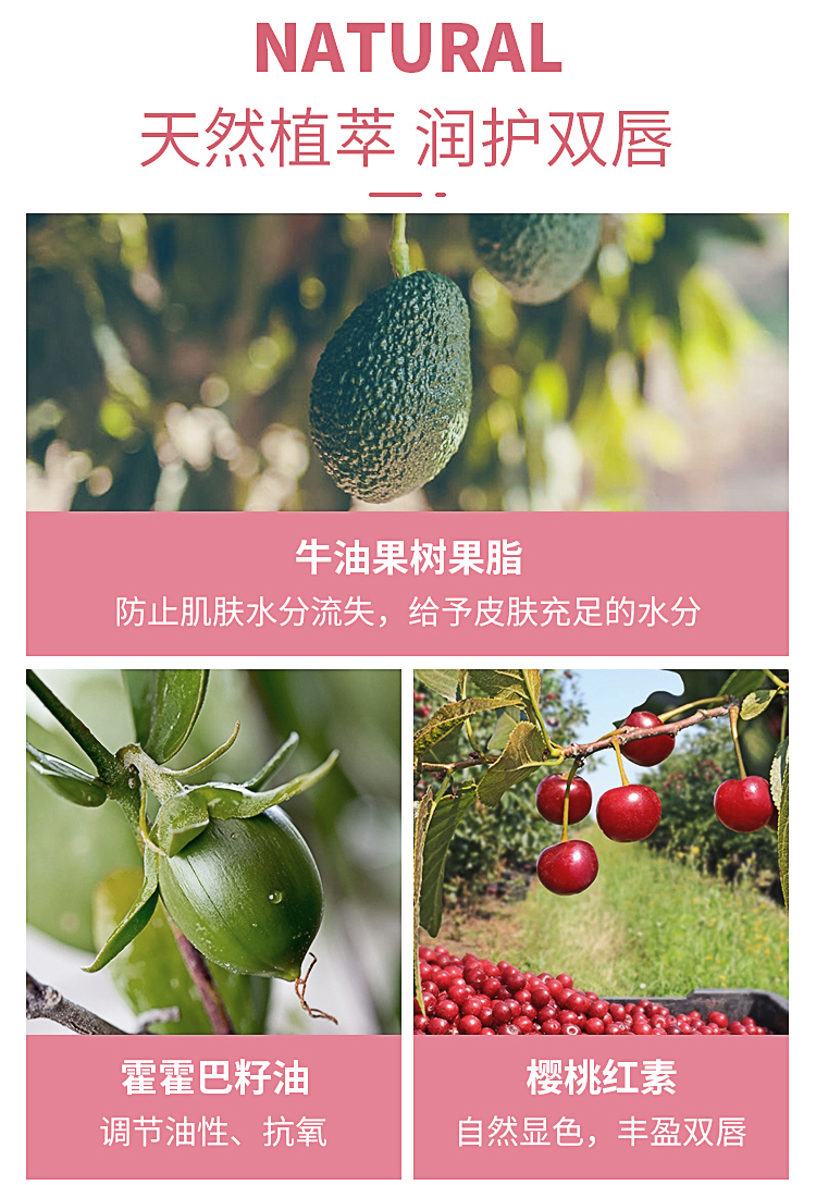 添加霍霍巴籽油保湿护唇精华,滋养、修护、抗氧、保湿四效合一,提亮气色,质地柔软细滑,滋润干燥唇肌,让双唇保持娇嫩丰盈,适合不同季节使用。(先用面纸按压唇部,擦拭干净,再将唇膏轻轻旋转出0.3cm左右,均匀涂抹于唇部即可)