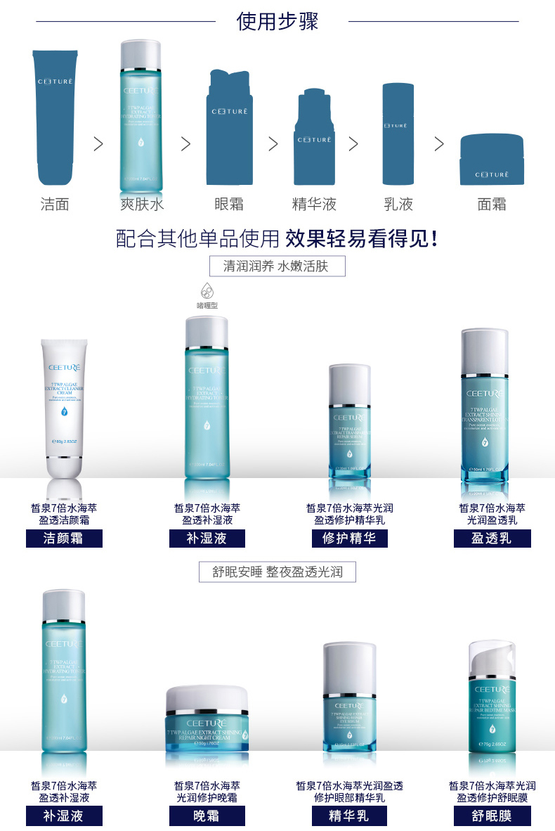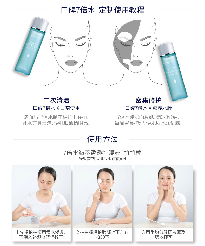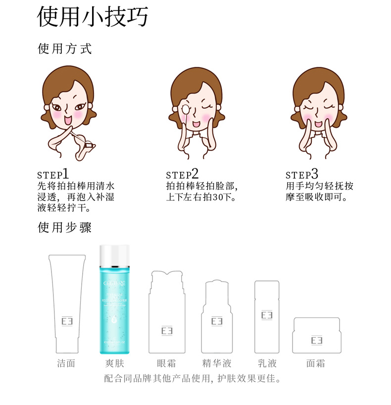 产品用法:早晚洗净肌肤后,取适量用手指或化妆棉轻拍于面部至吸收即可。