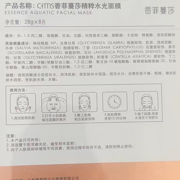• 商品名称:香菲蔓莎 精粹水光面膜28g*8片(时光修护面膜)滋养焕新,饱满弹性,修护肌底,改善细纹、松弛现象
