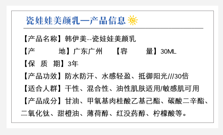 • 商品名称:韩伊美 瓷娃娃美颜乳30ml(SPF35倍防晒乳)抵御阳光、润色遮瑕、水感轻盈、防水防汗、修颜亮肌