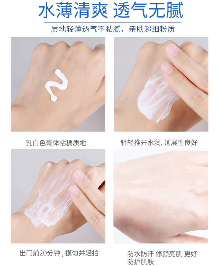 质地轻薄,修饰粗大毛孔,滋润、保湿、清爽不油腻,透现细腻、光彩肌肤
