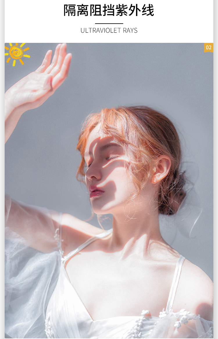 2.全频防护——有效阻挡UVA/UVB,同时隔离紫外线和室内外有害光线,彻底预防皱纹和晒斑。