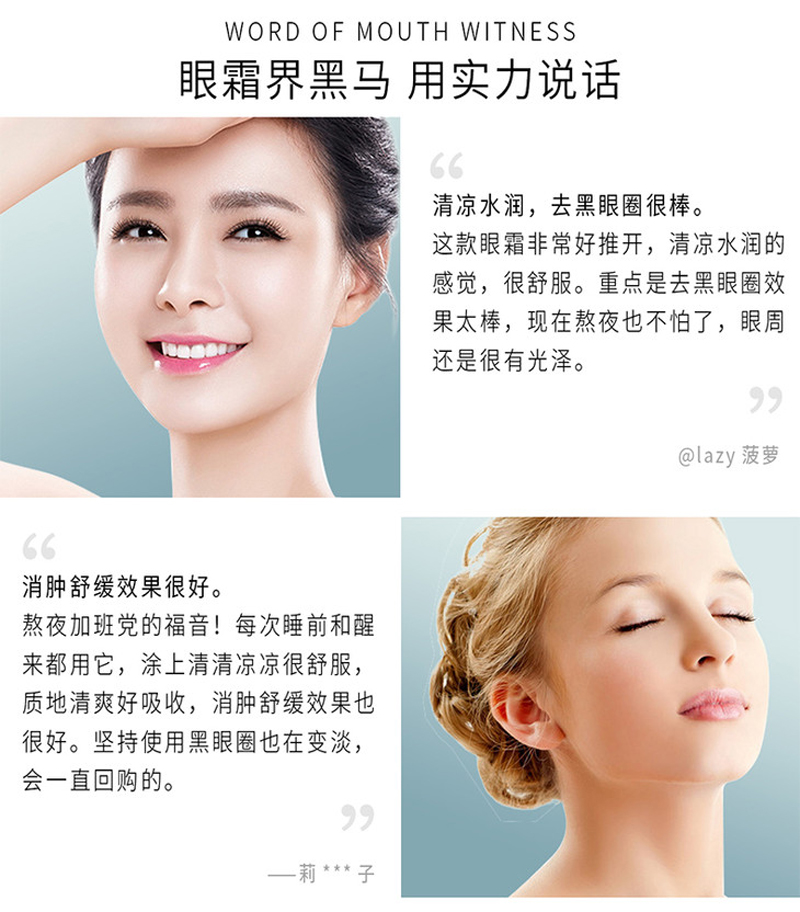 • 商品名称:拉普瑞斯 水凝玉肌高保湿眼霜15g 击退黑眼圈、淡化眼细纹、抚平眼袋、收紧泡泡眼