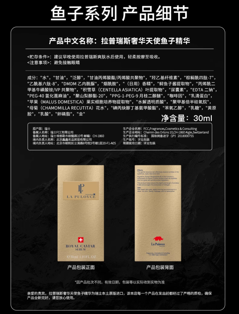 • 商品名称:拉普瑞斯 奢华天使鱼子精华30ml 滋补胶原蛋白、减缓肌肤老化、淡化细纹、弹嫩紧致、光滑嫩肤、提亮肤色、抗氧/水润