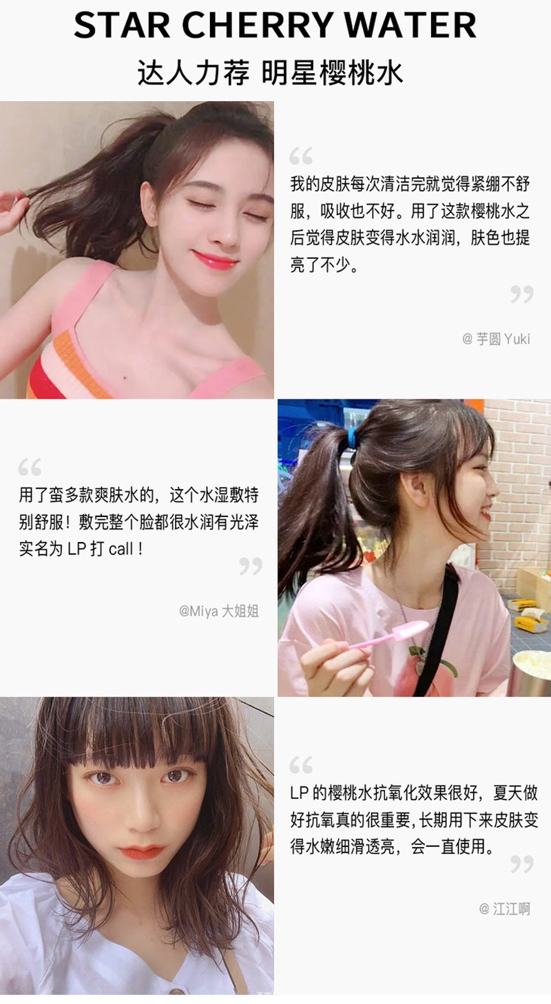 • 商品名称:拉普瑞斯 水凝玉肌高保湿水100ml(樱桃水)抗氧焕白、改善暗沉、均匀肤色、水润保湿、收敛舒缓、平衡水油