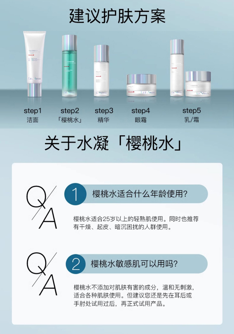 • 商品名称:拉普瑞斯 水凝玉肌高保湿水100ml(樱桃水) 抗氧焕白、改善暗沉、均匀肤色、水润保湿、收敛舒缓、平衡水油